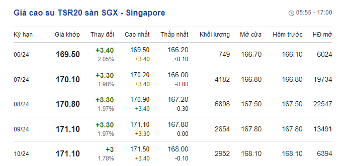 Theo đó, giá cao su giao kỳ hạn tháng 6/2024 tăng mạnh 2,05% lên mức 169,5 US cent/kg so với cuối phiên liền trước. Kỳ hạn giao hàng tháng 7/2024 là 170,10 US cent/kg, tăng 1,98%. Kỳ hạn giao hàng tháng 8/2024 là 170,8 US cent/kg, tăng 1,97%. Kỳ hạn giao hàng tháng 9/2024 là 170.1 US cent/kg tăng 1,97%. Kỳ hạn giao hàng tháng 10/2024 là 171.1 US cent/kg tăng 1,78%.
