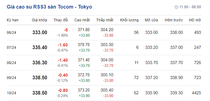 Cụ thể, giá cao su ­RSS3 hợp đồng kỳ hạn giao tháng 6/2024 ở mức 333 JPY/kg. Kỳ hạn giao hàng tháng 7/2024 là 335,4 JPY/kg. Kỳ hạn giao hàng tháng 8/2024 là 336,3 JPY/kg. Kỳ hạn giao hàng tháng 9/2024 là 338,5 JPY/tấn. Kỳ hạn giao hàng tháng 10/2024 là 338,5 JPY/kg.