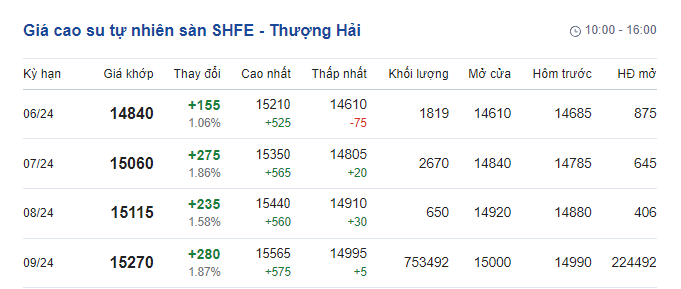 Cao su tự nhiên giao dịch trên sàn SHFE - Thượng Hải từ 10h00 đến 12h30, 13h30 đến 16h00, giờ Việt Nam.