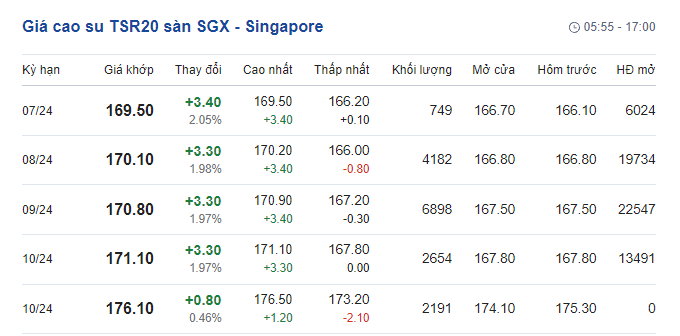 Theo đó, giá cao su giao kỳ hạn tháng 7/2024 tăng mạnh 2,05% lên mức 169,5 US cent/kg so với cuối phiên liền trước. Kỳ hạn giao hàng tháng 8/2024 là 170,10 US cent/kg, tăng 1,98%. Kỳ hạn giao hàng tháng 9/2024 là 170,8 US cent/kg, tăng 1,97%. Kỳ hạn giao hàng tháng 10/2024 là 171.1 US cent/kg tăng 1,97%. Kỳ hạn giao hàng tháng 10/2024 là 176,1 US cent/kg tăng 0,46%.
