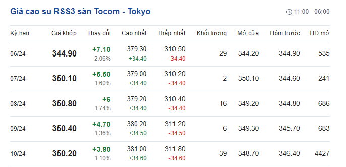 Cụ thể, giá cao su RSS3 hợp đồng kỳ hạn giao tháng 6/2024 ở mức 344.9 JPY/kg. Kỳ hạn giao hàng tháng 7/2024 là 350.1 JPY/kg. Kỳ hạn giao hàng tháng 8/2024 là 350.8 JPY/kg. Kỳ hạn giao hàng tháng 9/2024 là 350.4 JPY/tấn. Kỳ hạn giao hàng tháng 10/2024 là 350.2 JPY/kg.
