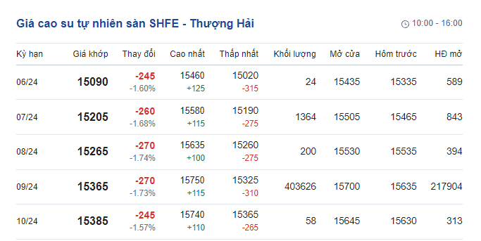 Tương tự, giá cao su tự nhiên Sàn giao dịch hàng hóa tương lai Thượng Hải (SHFE) cũng có mức giảm ở các kỳ hạn, dao động từ 15.090 - 15.385 CNY/tấn.