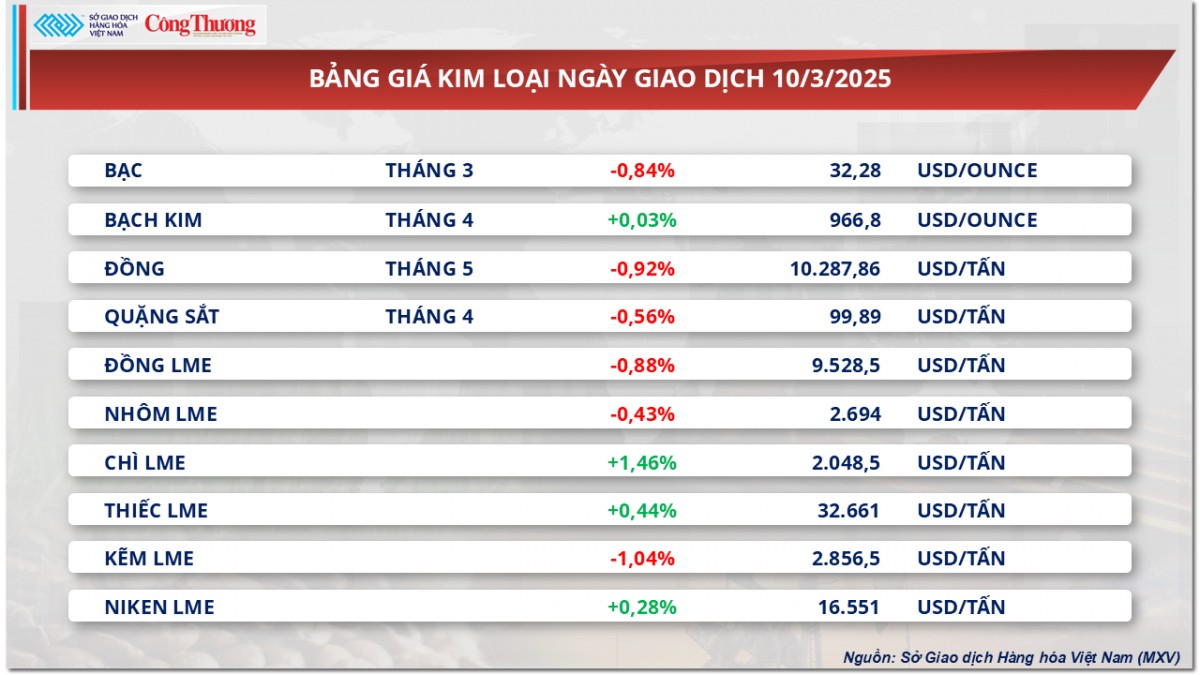 Sở Giao dịch Hàng hóa Việt Nam (MXV) cho biết, sau ba phiên phục hồi, đóng cửa ngày hôm qua, lực bán chiếm ưu thế đã kéo chỉ số MXV-Index giảm 0,32% xuống mức 2.271 điểm. Trên thị trường năng lượng, giá dầu tiếp tục chịu áp lực trước lo ngại rằng chính sách thuế quan của Mỹ đối với hàng hóa từ Mexico, Canada và Trung Quốc. Đặc biệt, việc Mỹ áp lên Trung Quốc - khách hàng nhập khẩu đậu tương lớn nhất càng làm dấy lên lo ngại về triển vọng tiêu thụ mặt hàng này, qua đó, tác động mạnh lên thị trường nông sản.