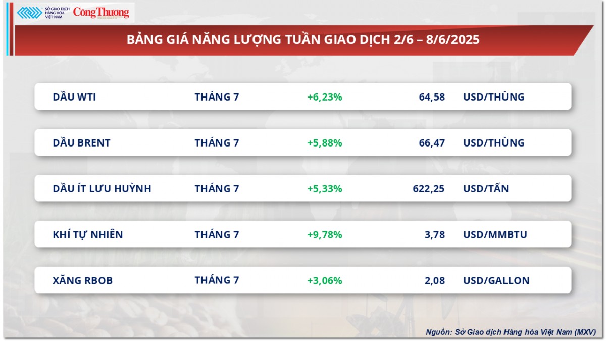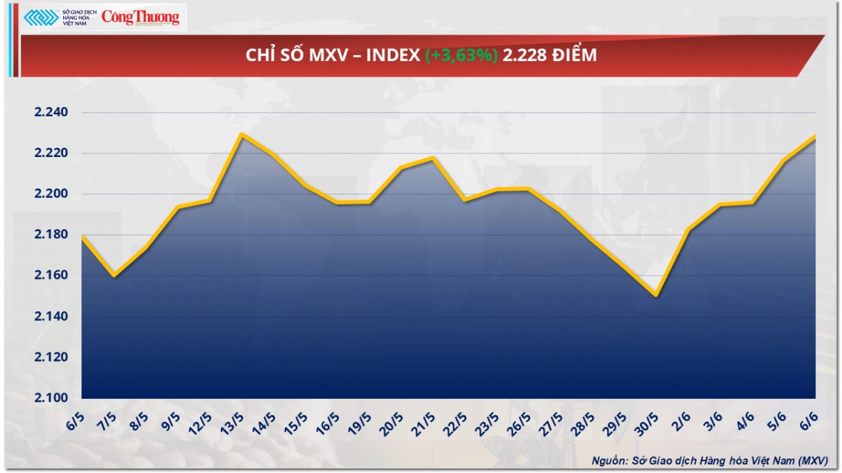 Theo Sở Giao dịch Hàng hóa Việt Nam (MXV), sau 5 phiên liên tiếp phục hồi, đóng cửa phiên giao dịch tuần qua, chỉ số MXV-Index tăng mạnh hơn 3,6% lên 2.228 điểm. Dòng tiền đầu tư quay trở lại thị trường hàng hóa nguyên liệu thế giới. Nhóm năng lượng gây chú ý khi toàn bộ 5 mặt hàng khép tuần trong sắc xanh, trong đó nhiều mặt hàng tăng vọt tới 5-6%. Chỉ số MXV-Index năng lượng đo lường biến động giá của các mặt hàng trong nhóm bật tăng hơn 6%, dẫn dắt đà khởi sắc của toàn thị trường. Ở chiều ngược lại, trên thị trường nguyên liệu công nghiệp, giá đường lao dốc tuần thứ 4 liên tiếp.