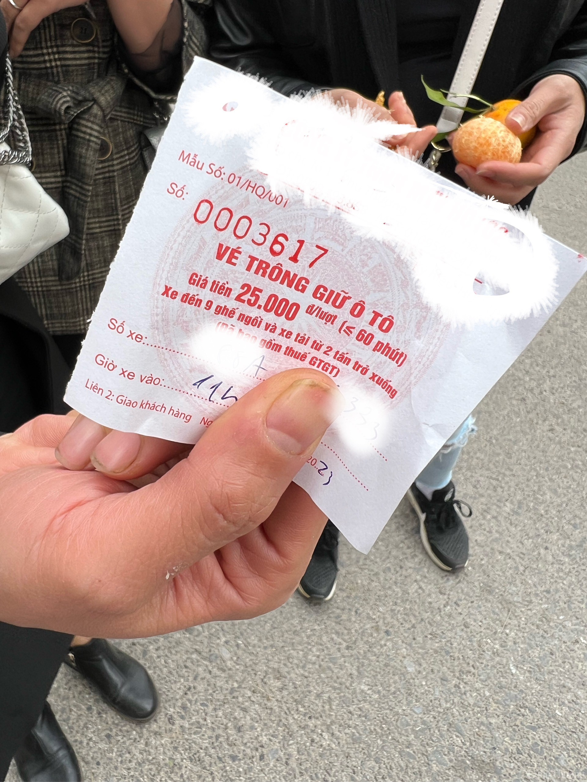 | Vé gửi xe ô tô vào phủ Tây Hồ tại một bãi xe khác, ghi rõ giờ xe vào bãi để thu phí. Tuy nhiên, nhiều khách gửi xe không được hướng dẫn lấy tấm vé này |