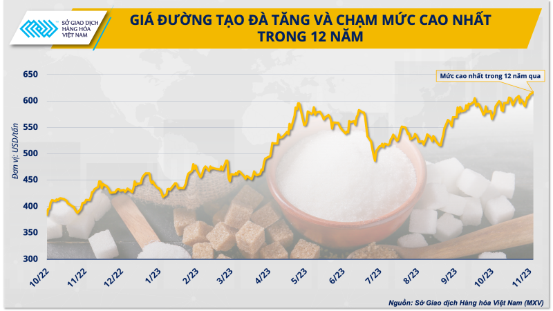 Giá đường trên Sở Giao dịch Liên lục địa New York (ICE-US) đã neo ở mức cao 12 năm kể từ đầu tháng 9 đến nay. Sở Giao dịch Hàng hóa Việt Nam (MXV) cho biết kết phiên ngày 6/11, giá đường đã dừng ở 616,2 USD/tấn - mức cao nhất tính từ tháng 10/2011. Như vậy, giá mặt hàng này hiện đã tăng 150% so với hồi đầu năm và đà tăng này bắt đầu kể từ quý IV năm ngoái.