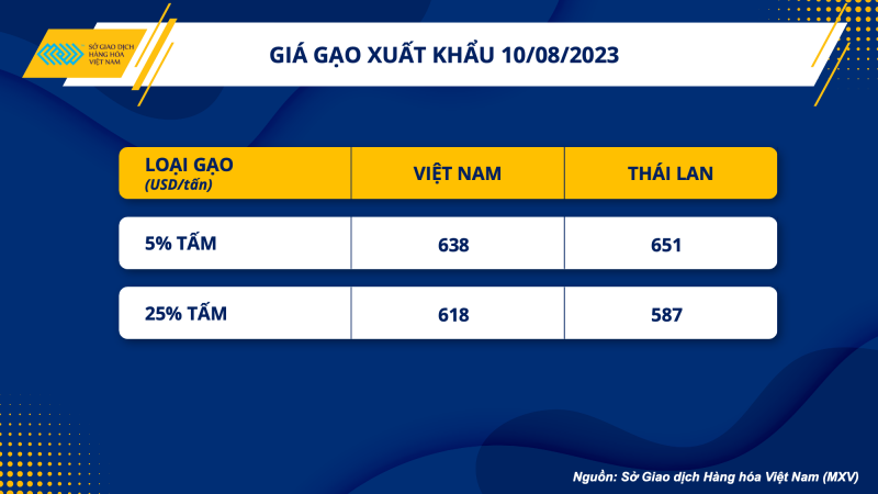 Tại thị trường gạo châu Á, dữ liệu mới nhất của Hiệp hội Lương thực Việt Nam cho thấy, tính đến ngày 10/08, giá gạo xuất khẩu tiếp tục tăng so tuần trước đó. Cụ thể, giá gạo 5% tấm Việt Nam xuất khẩu tăng 20 USD/tấn lên 638 USD/tấn; gạo Thái Lan 5% tấm tăng 10 USD/tấn lên 651 USD/tấn. Đối với gạo 25% tấm, giá xuất khẩu của nước ta cũng đã tăng 20 USD/tấn lên 618 USD/tấn, nối dài khoảng cách lên tới 31 USD/tấn so với giá gạo cùng loại của Thái Lan. Như vậy, trong 1 tháng trở lại đây, giá gạo xuất khẩu của nước ta có sức tăng mạnh nhất so với các đối thủ cùng khu vực.