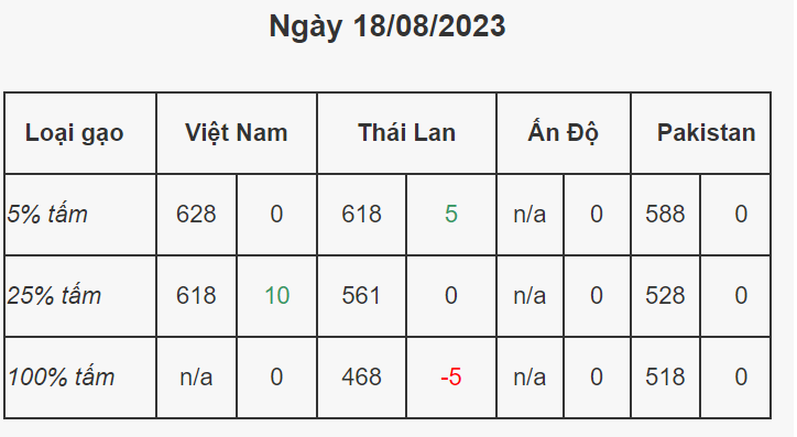 Như vậy, giá gạo 5% tấm ngày 17/8 của Thái Lan chỉ còn 613 - 617 USD/tấn, trong khi giá gạo 25% là 561 - 565 đô la/tấn. Với mặt bằng giá mới được thiết lập vào ngày 17/8, gạo 5% tấm của Việt Nam cao hơn của Thái Lan 15 USD/tấn và gạo 25% tấm cao hơn 47 USD/tấn.