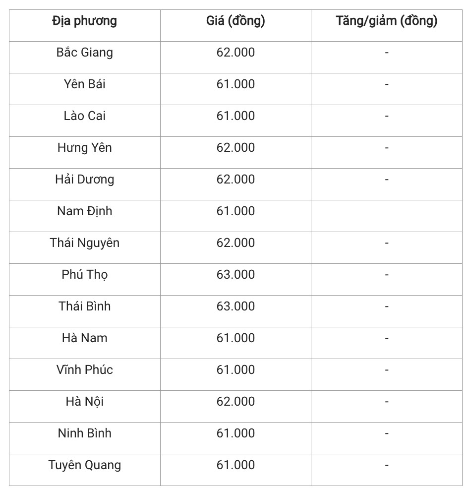 Hiện tại, giá heo hơi tại khu vực này dao động từ 61.000 - 63.000 đồng/kg. Trong đó, Thái Bình và Phú Thọ đang giao dịch cao nhất khu vực, với mức 63.000 đồng/kg,