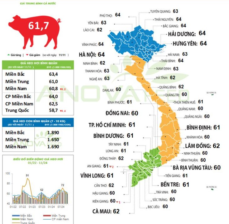Sau khi giảm hai giá, thương lái tại An Giang đnag thu mua heo hơi với giá 61.000 đồng/kg ngang bằng với tại Bình Phước , TP HCM, Bình Dương, Tây Ninh, Long An,Vĩnh Long, Cà Mau, Tiền Giang, Bến Tre.