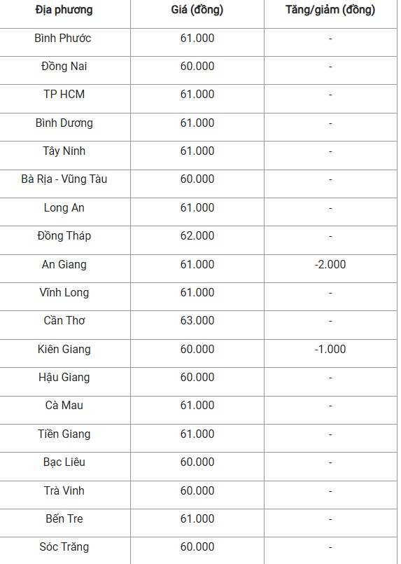 Ở chiều ngược lại, sau khi giảm một giá, thương lái tại Kiên Giang đang thu mua heo hơi với giá 60.000 đồng/kg ngang bằng với tại Sóc Trăng, Trà Vinh, Hậu Giang, Đồng Nai, Bà Rịa - Vũng Tàu, Bạc Liêu ghi nhận đây là mức giá thấp nhất khu vực.