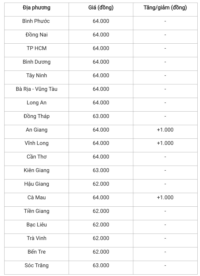 Hiện giá heo hơi tại khu vực này dao động từ 62.000 - 64.000 đồng/kg. Các tỉnh Hậu Giang, Tiền Giang, Bến Tre, Trà Vinh, Bến Tre và Bạc Liêu có giá heo hơi thấp nhất với mức 62.000 đồng/kg,