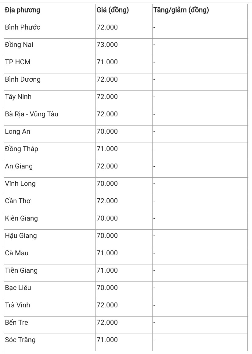 Hiện giá heo hơi khu vực này vẫn duy trì dao động 70.000 – 73.000 đồng/kg. Tỉnh Đồng Nai là địa phương có giá heo hơi cao nhất cả nước với 73.000 đồng/kg. Phần lớn giá heo hơi tại các tỉnh thành trong khu vực được dao dịch trong khoảng 70.000 – 72.000 đồng/kg.