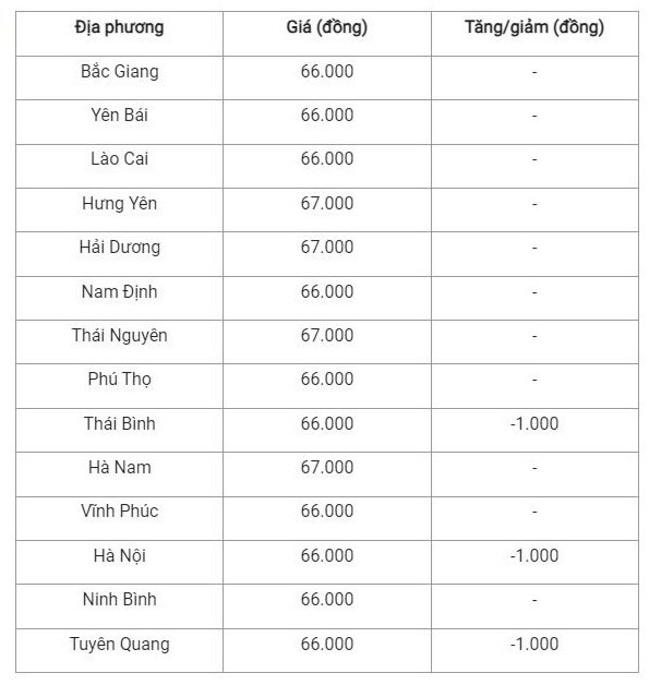 Các tỉnh, thành phố ghi nhận giảm 1.000 đồng/kg là: Hà Nội, Thái Bình, Tuyên Quang về cùng giá 66.000 đồng/kg. Cao nhất khu vực phải kể đến các tỉnh như: Hưng Yên, Hải Dương, Thái Nguyên, Hà Nam ở mức 67.000 đồng/kg.