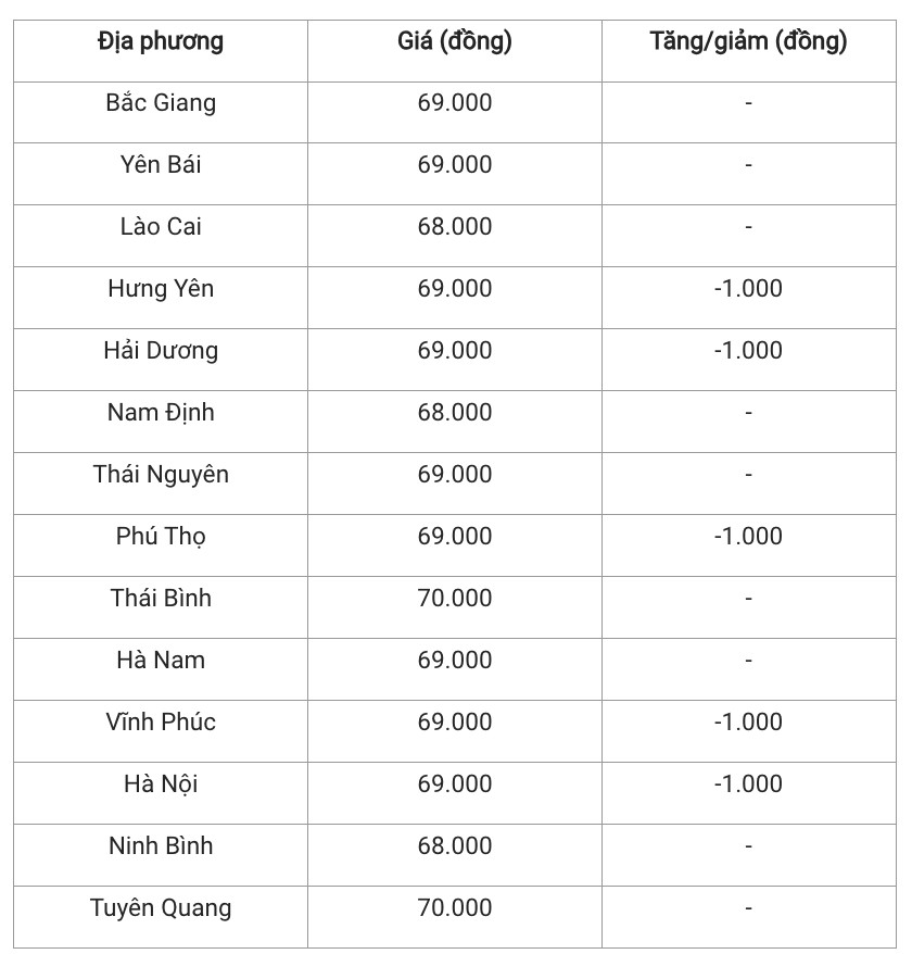 Trong đó, tỉnh Lâm Đồng và Thanh Hoá có giá heo hơi cao nhất khu vực với mức giá 69.000 đồng/kg. Các tỉnh còn lại có giá heo hơi dao động từ 66.000 - 67.000 đồng/kg.