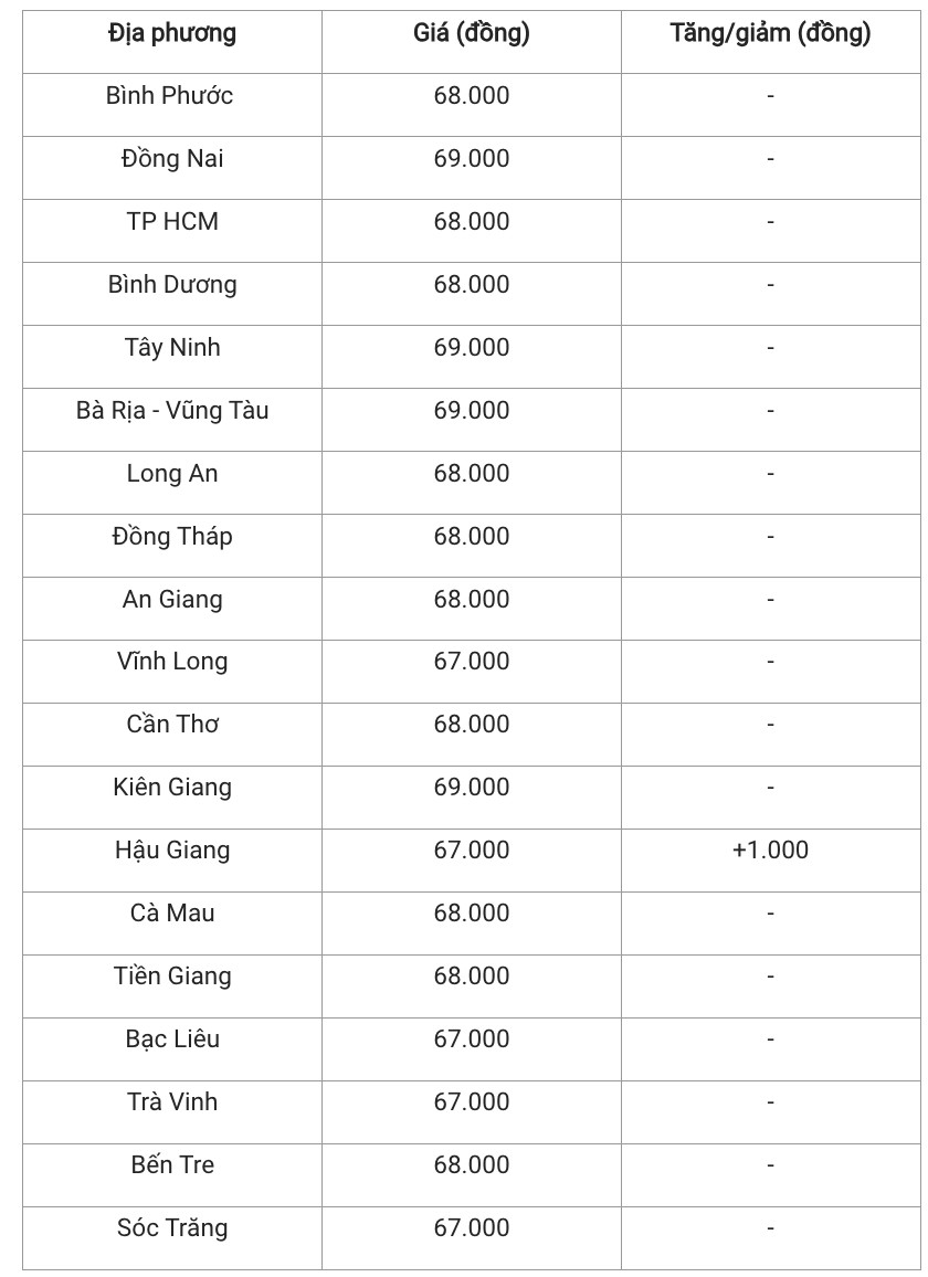 Hiện tại, giá heo hơi khu vực miền Nam đang dao động 67.000 - 69.000 đồng/kg. Trong đó, Bà Rịa – Vũng Tàu, Kiên Giang Đồng Nai và Tây Ninh có giá heo hơi cao nhất khu vực với 69.000 đồng/kg. Các tỉnh còn lại, có giá heo hơi dao động phổ biến từ 67.000 đến 68.000 đồng/kg.