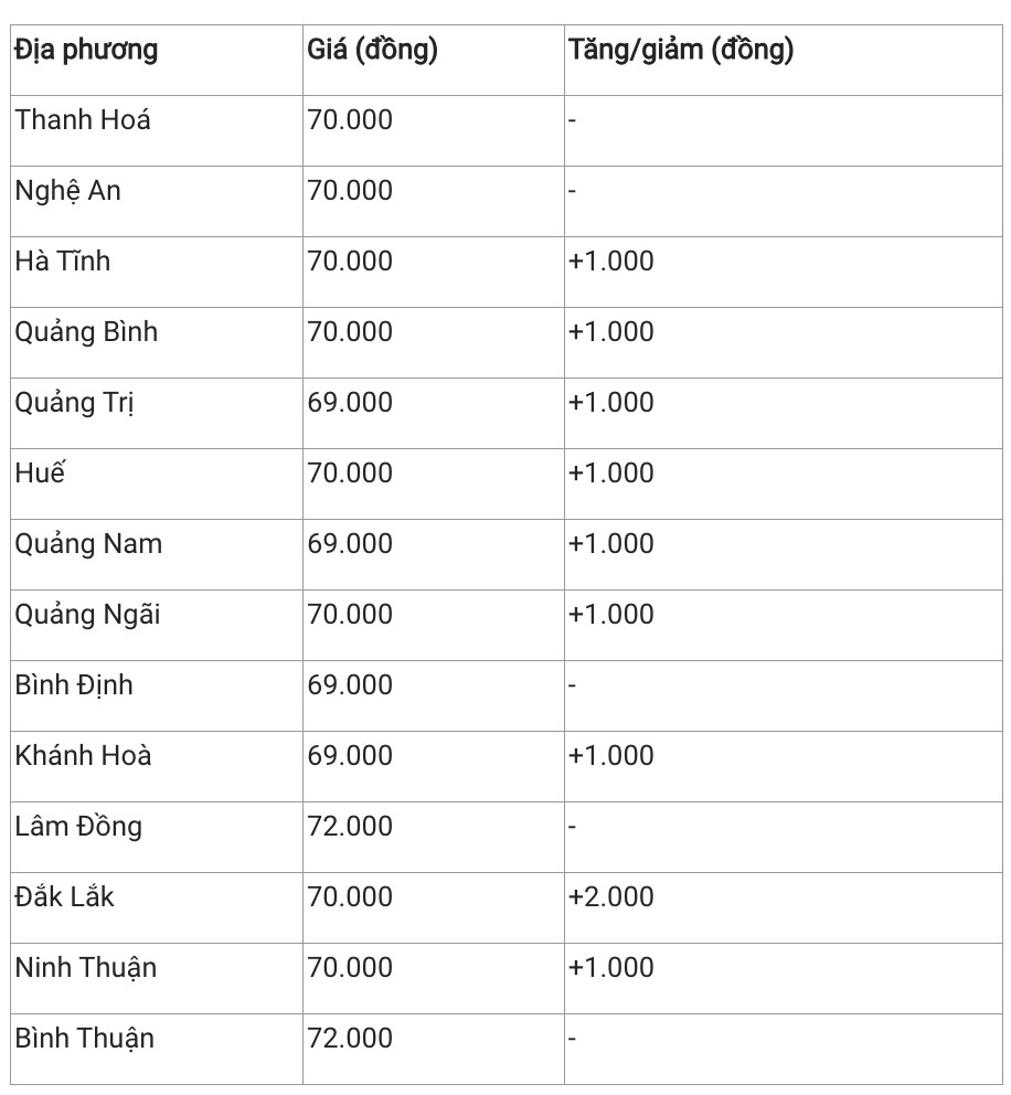 Hiện, giá heo hơi khu vực này dao động trong khoảng 69.000 – 72.000 đồng/kg. Trong đó, Bình Thuận và Lâm Đồng có giá heo hơi cao nhất khu vực với 72.000 đồng/kg. Ngược lại, Quảng Trị, Quảng Nam, Khánh Hoà, Bình Định bán heo hơi thấp nhất khu vực với mức 69.000 đồng/kg.
