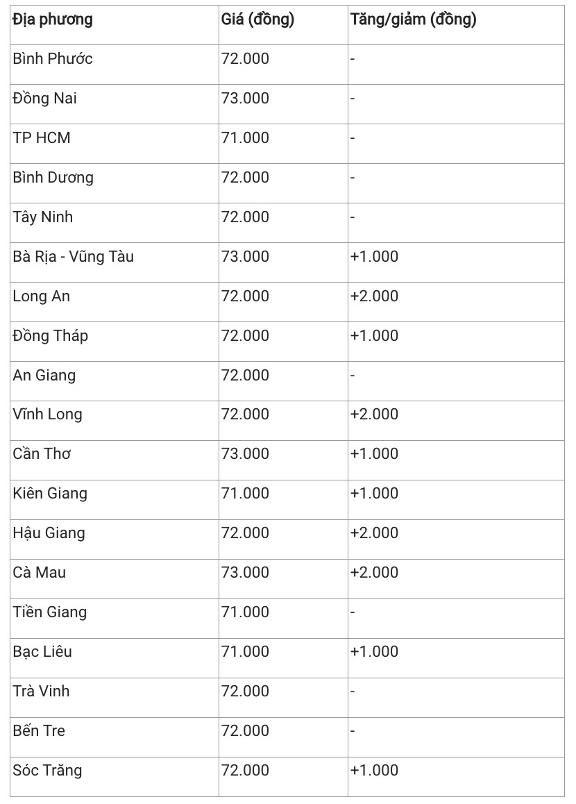 Hiện giá heo hơi khu vực này dao động trong khoảng 70.000 – 73.000 đồng/kg. Trong đó, cùng với Đồng Nai, các tỉnh Bà Rịa – Vũng Tàu, Cần Thơ và Cà Mau thiết lập bảng giá mới với 73.000 đồng/kg, đây giá heo hơi cao nhất cả. Còn lại các tỉnh thành trong khu vực dao dịch trong khoảng 70.000 – 72.000 đồng/kg.