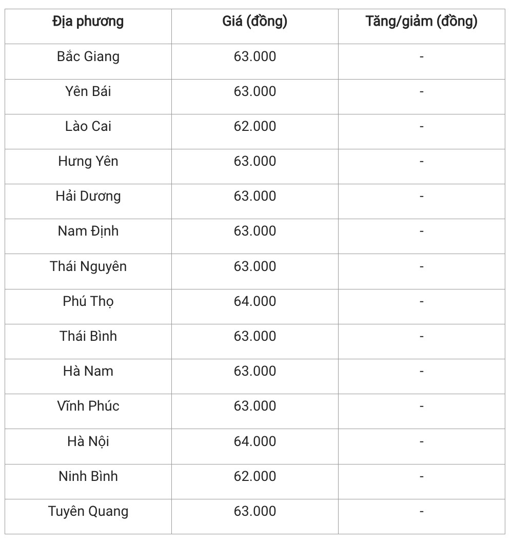 Còn lại các tỉnh như Bắc Giang; Yên Bái; Hưng Yên; Hải Dương; Nam Định; Thái Nguyên; Thái Bình; Hà Nam; Vĩnh Phúc; Tuyên Quang duy trì ở mức 62.000 - 63.000 đồng/kg.