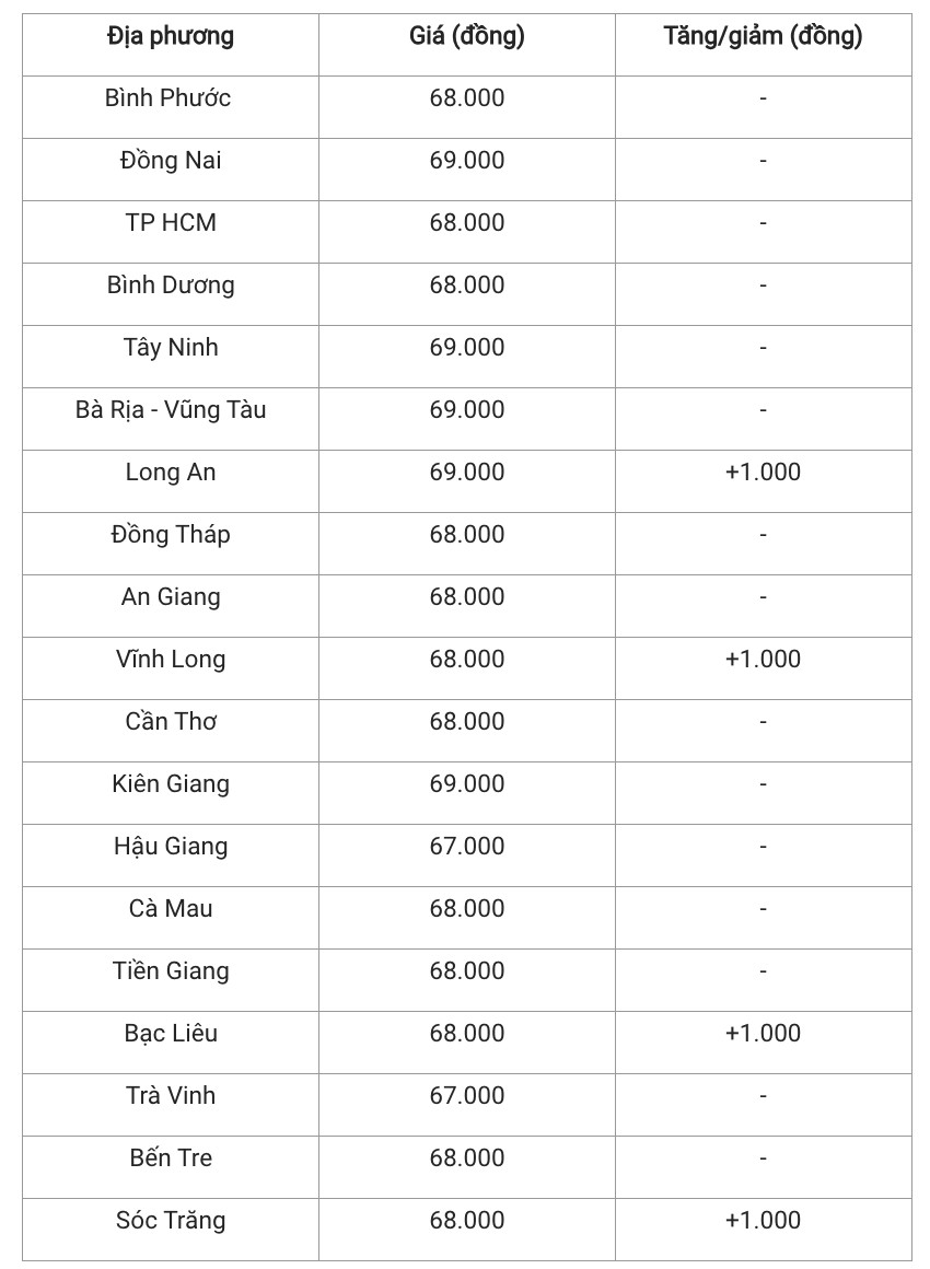 Hiện giá heo hơi khu vực miền Nam đang dao động 67.000 - 69.000 đồng/kg. Trong đó, Bà Rịa – Vũng Tàu, Kiên Giang Đồng Nai và Tây Ninh có giá heo hơi cao nhất khu vực với 69.000 đồng/kg. Các tỉnh còn lại, có giá heo hơi dao động phổ biến từ 67.000 đến 68.000 đồng/kg.