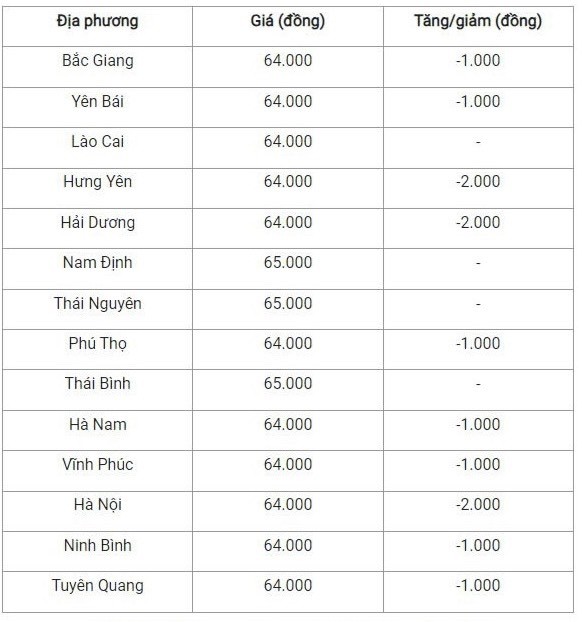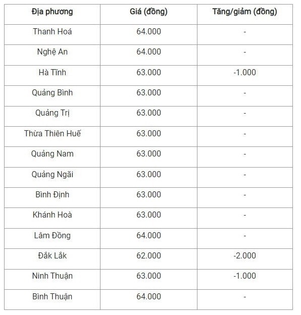 Cụ thể, hai tỉnh Hà Tĩnh và Ninh Thuận giảm 1.000 đồng/kg về cùng mốc 63.000 đồng/kg. Đặc biệt, riêng tỉnh Đắk Lắk giảm 2.000 đồng/kg về mốc 62.000 đồng/kg.