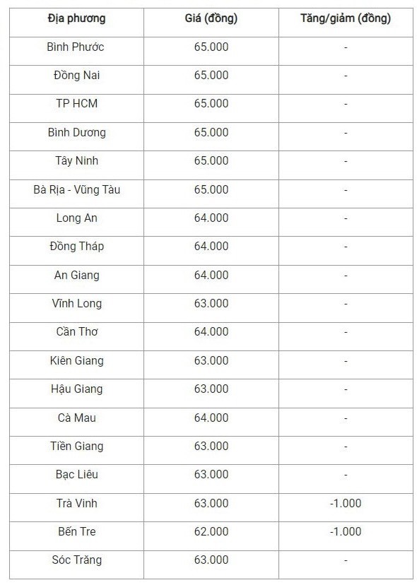 Cao nhất trong khu vực là các tỉnh, thành phố: Bình Phước, Đồng Nai, Bình Dương, Tây Ninh, Bà Rịa - Vũng Tàu và TP HCM cùng mua bán tại giá 65.000 đồng/kg. Các địa phương còn lại giao dịch ở môsc 64.000 đồng/kg.