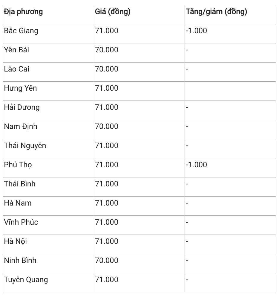 Như vậy, giá heo hơi khu vực này dao động trong khoảng 70.000 - 71.000 đồng/kg. Trong đó, Lào Cai, Nam Định và Ninh Bình là hai địa phương có giá thấp nhất khu vực, cùng giao dịch tại mức 70.000 đồng/kg.