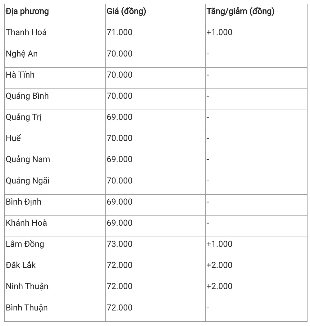 Hiện, giá heo hơi khu vực này dao động trong khoảng 69.000 – 73. 000 đồng/kg. Với tăng giá trong phiên sáng nay, Lâm Đồng đang là địa phương có giá cao nhất khu vực với 73.000 đồng/kg. Ngược lại, Quảng Trị, Quảng Nam, Khánh Hoà, Bình Định bán heo hơi thấp nhất khu vực với mức 69.000 đồng/kg.