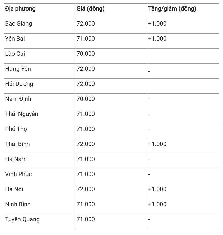 Hiên giá heo hơi khu vực này dao động trong khoảng 70.000 - 72.000 đồng/kg. Trong đó, Lào Cai, Nam Định là hai địa phương có giá heo hơi thấp nhất khu vực với mức 70.000 đồng/kg. Các tỉnh còn lại có giá heo hơi phổ biến từ 71.000 đến 72.000 đồng/kg.
