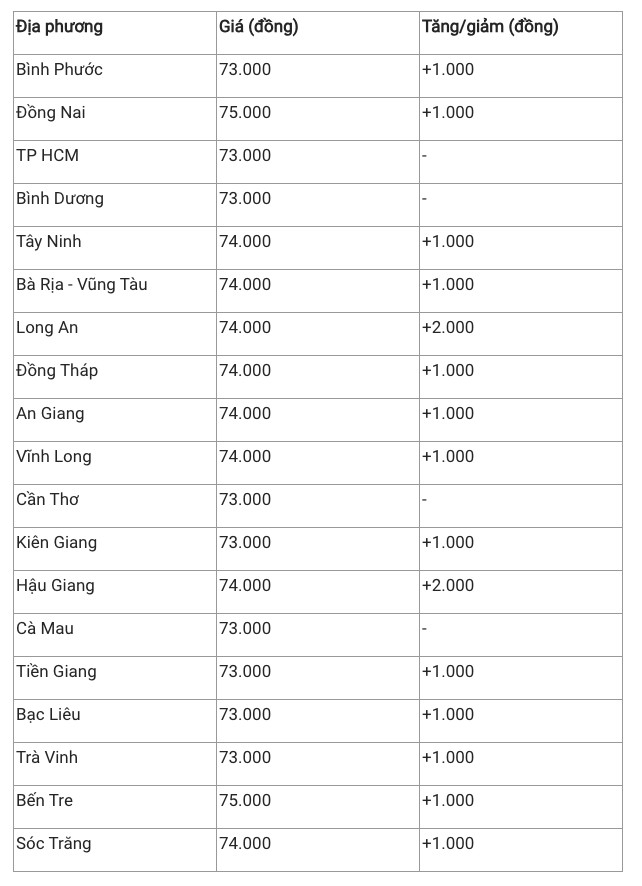 Hiện giá heo hơi khu vực này vẫn duy trì dao động 73.000 – 75.000 đồng/kg. Đây cũng là khu vực có giá heo hơi cao nhất cả nước, trong đó Đồng Nai và Bến Tre thiết lập mức giá cao nhất cả nước với 75.000 đồng/kg. Nhiều địa phương khác như Bà Rịa – Vũng Tàu, Tây Ninh, Sóc Trăng… ghi nhận mức giá 74.000 đồng/kg.