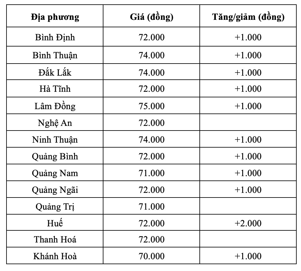 Hiện giá heo hơi khu vực này vẫn duy trì dao động 71.000 – 75.000 đồng/kg. Trong đó, Lâm Đồng đang là địa phương có giá cao nhất khu vực với 75.000 đồng/kg, tiếp đến Đắk Lắk, Bình Thuận có giá 74.000 đồng/kg. Ngược lại, Quảng Trị, Khánh Hoà bán heo hơi thấp nhất khu vực với mức 71.000 đồng/kg.