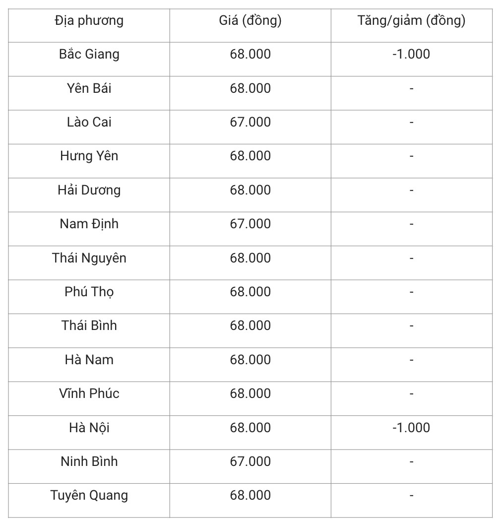 Hiện giá heo hơi tại khu vực miền Bắc dao động trong khoảng 67.000 - 68.000 đồng/kg. Trong đó, các tỉnh Lào Cai, Nam Định và Ninh Bình là những địa phương bán heo hơi với giá thấp nhất khu vực, tại mức 67.000 đồng/kg.