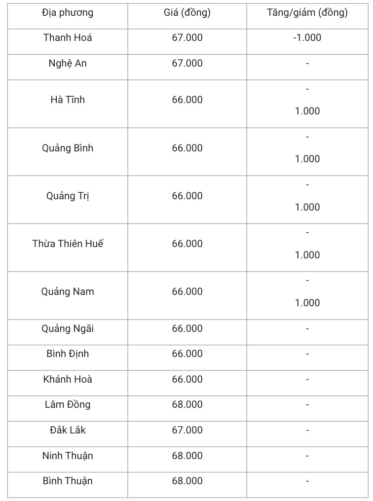 Hiện giá heo hơi khu vực này dao động trong khoảng 66.000 - 68.000 đồng/kg. Trong đó, ba tỉnh Lâm Đồng, Ninh Thuận và Bình Thuận là những địa phương có giá heo hơi cao nhất khu vực, đạt 68.000 đồng/kg. Ngược lại, mức giao dịch thấp nhất là 66.000 đồng/kg xuất hiện tại hai tỉnh Bình Định và Khánh Hoà.