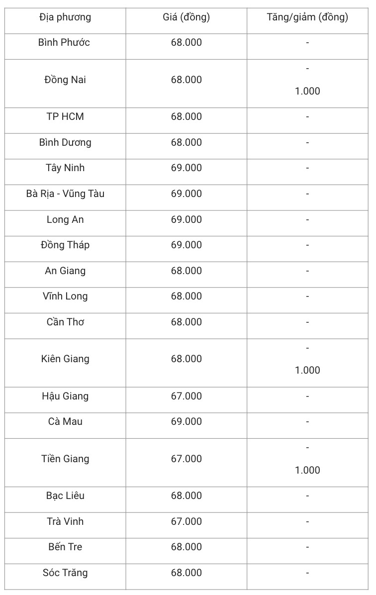 Hiện giá heo hơi khu vực này vẫn duy trì dao động 67.000 - 69.000 đồng/kg. Trong đó,Tây Ninh, Bà Rịa - Vũng Tàu, Long An, Đồng Tháp và Cà Mau là những tỉnh có giá heo hơi cao nhất vùng, đạt 69.000 đồng/kg. Ở chiều ngược lại, Trà Vinh và Hậu Giang có giá heo hơi đạt 67.000 đồng/kg, thấp nhất khu vực.