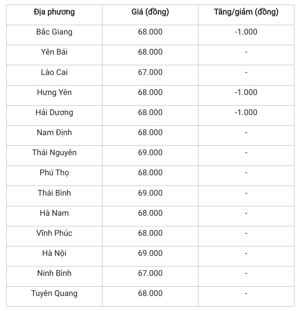 Hiện tại, các thương lái phía Bắc đang thu mua heo hơi trong khoảng 67.000 - 69.000 đồng/kg. Trong đó, các tỉnh thành như Thái Nguyên, Hải Dương, Hưng Yên và Nam Định, Hà Nội, Bắc Giang và Thái Bình có giá heo hơi cao nhất cả nước 69.000 đồng/kg. Các địa phương còn lại trong khu vực có giá heo hơi phổ biến trong khoảng 67.000 - 68.000 đồng/kg.