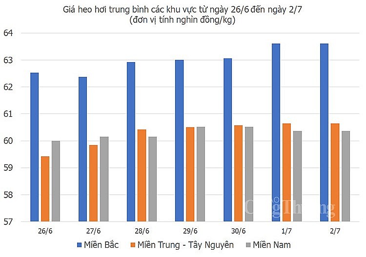 Cụ thể, ghi nhận ngày cuối tuần (2/7/2023), giá heo hơi trung bình tại khu vực miền Bắc lên mức 63.610 đồng/kg, giá heo hơi trung bình tại khu vực miền Trung – Tây Nguyên ghi nhận ở mức 60.640 đồng/kg và tại khu vực miền Nam ở mức 60.360 đồng/kg. So với mức thấp nhất hồi tháng 4, đến nay giá heo hơi đã tăng khoảng 37%.