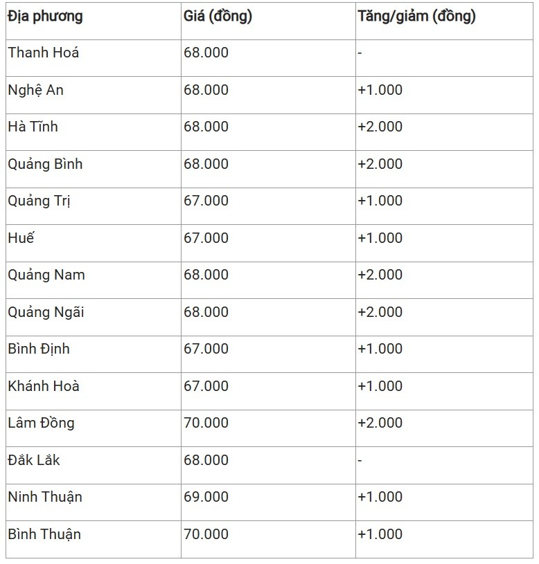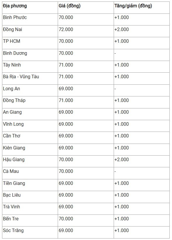 Trong đó, Đồng Nai là địa phương duy nhất xuất hiện mức 72.000 đồng/kg, cao nhất cả nước. Thấp hơn một giá là Bà Rịa - Vũng Tàu, Tây Ninh và Đồng Tháp cùng giao dịch tại giá 71.000 đồng/kg.