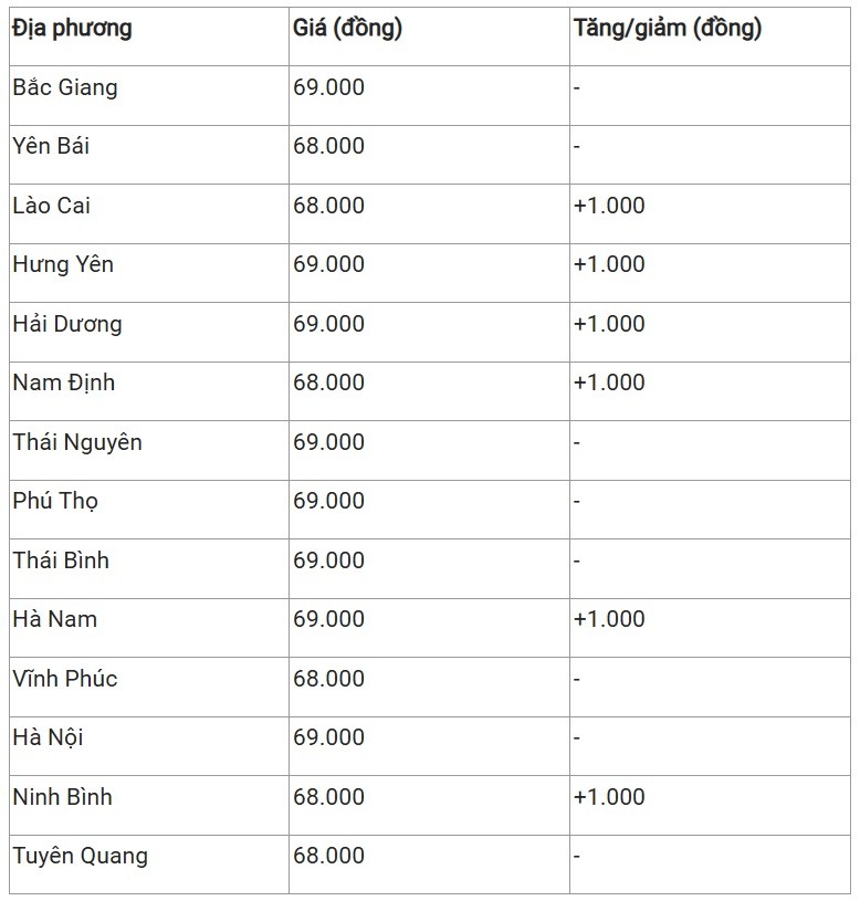 Hiện tại, heo hơi tại khu vực này được thu mua với giá từ 68.000 - 69.000 đồng/kg. Trong đó, mức 69.000 đồng/kg được ghi nhận tại: Hà Nội, Phú Thọ, Thái Nguyên, Bắc Giang, Hải Dương, Hưng Yên, Hà Nam và Thái Bình.