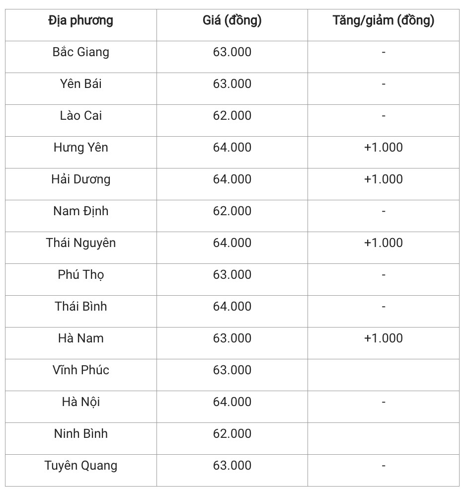 Như vậy, toàn khu vực miên Bắc thu mua heo hơi trong khoảng 62.000 - 64.000 đồng/kg. Trong đó, Thái Nguyên, Hưng Yên, Hải Dương, Hà Nội và Thái Bình. Hà Nội giá cao nhất cả nước với 64.000 đồng/kg.