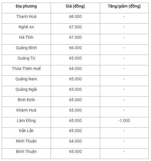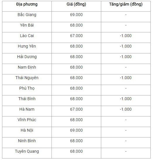 Các tỉnh còn lại như: Yên Bái, Phú Thọ, Vĩnh Phúc, Ninh Bình, Nam Đình..., giá đi ngang giao dịch ở mức 68.000 đồng/kg.