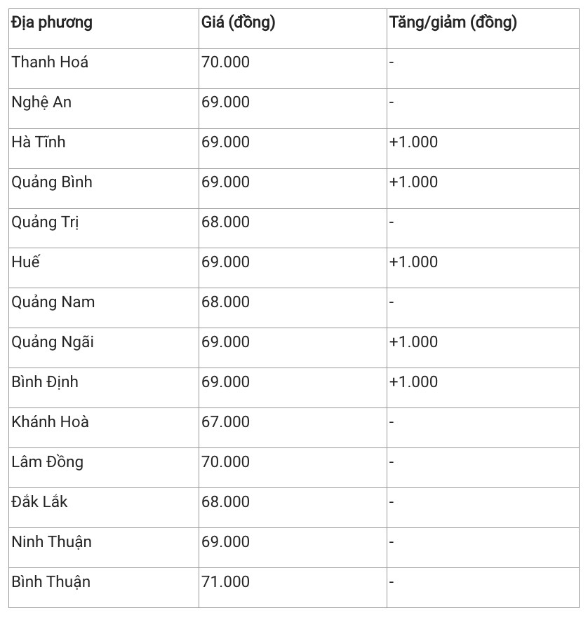 Hiện, giá heo hơi khu vực này dao động trong khoảng 67.000 – 71.000 đồng/kg. Trong đó, các tỉnh tỉnh Khánh Hoà là địa phương có giá thấp nhất cả nước với 67.000 đồng/kg. Ngược lại, Bình Thuận có giá heo hơi cao nhất khu vực với 71.000 đồng/kg.