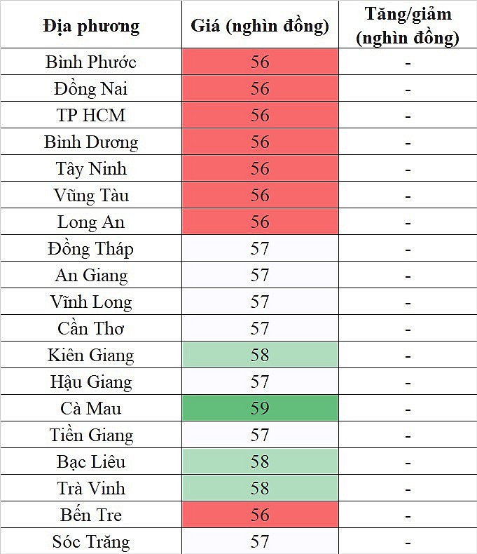 Thương lái tại các tỉnh còn lại duy trì giao dịch ổn định trong khoảng 56.000 - 57.000 đồng/kg.