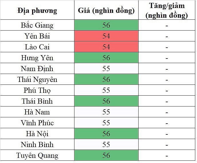 Ở chiều ngược lại, mức giá cao nhất khu vực 56.000 đồng/kg được ghi nhận tại Bắc Giang, Hưng Yên, Thái Nguyên, Thái Bình, Hà Nội, Tuyên Quang.