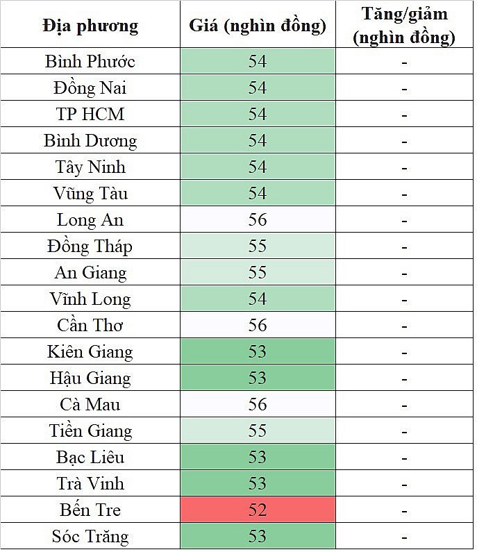 Theo đó, mức giá thấp nhất khu vực 52.000 đồng được ghi nhận tại Bến Tre.