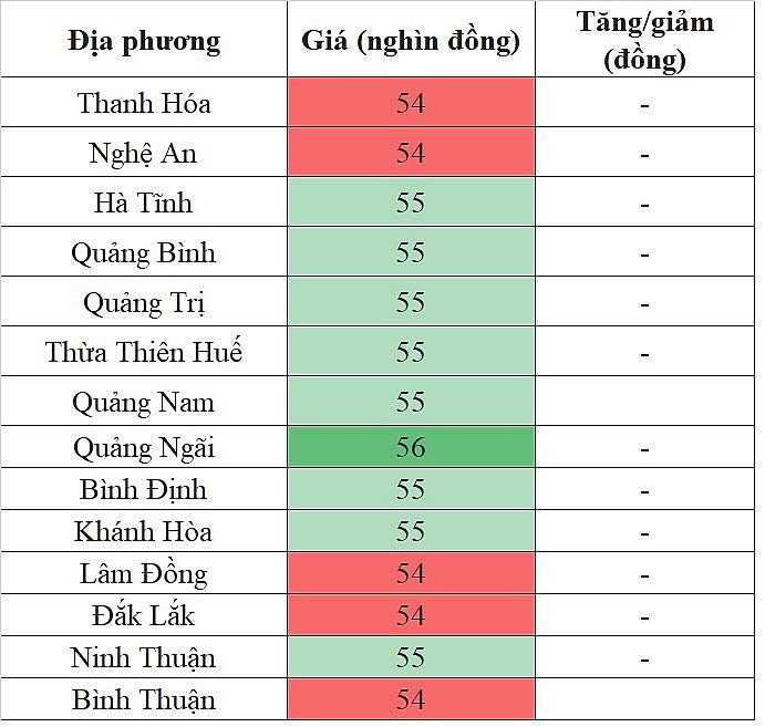 Ở chiều ngược lại, mức giá cao nhất khu vực 56.000 đồng/kg được ghi nhận tại Quảng Ngãi.