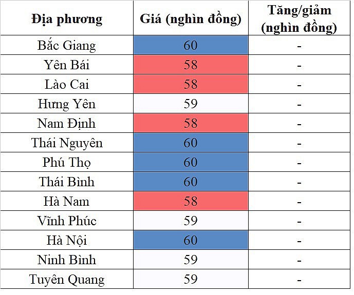 Theo đó, mức giá cao nhất khu vực 60.000 đồng/kg được ghi nhận tại Bắc Giang, Thái Nguyên, Phú Thọ, Thái Bình, Hà Nội.