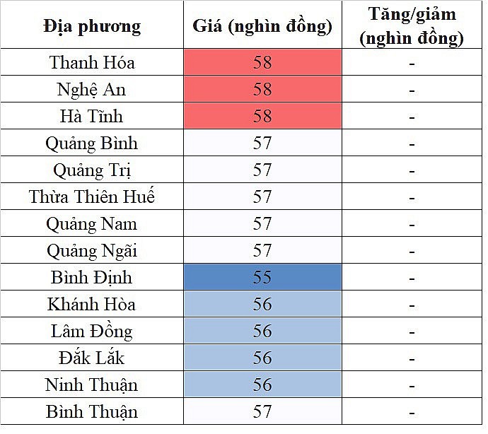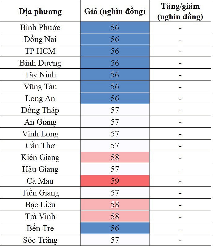Mức giá thấp nhất khu vực 56.000 được ghi nhận tại các địa phương gồm Bình Phước, Đồng Nai, TP. Hồ Chí Minh, Bình Dương, Tây Ninh, Vũng Tàu, Long An, Bến Tre.