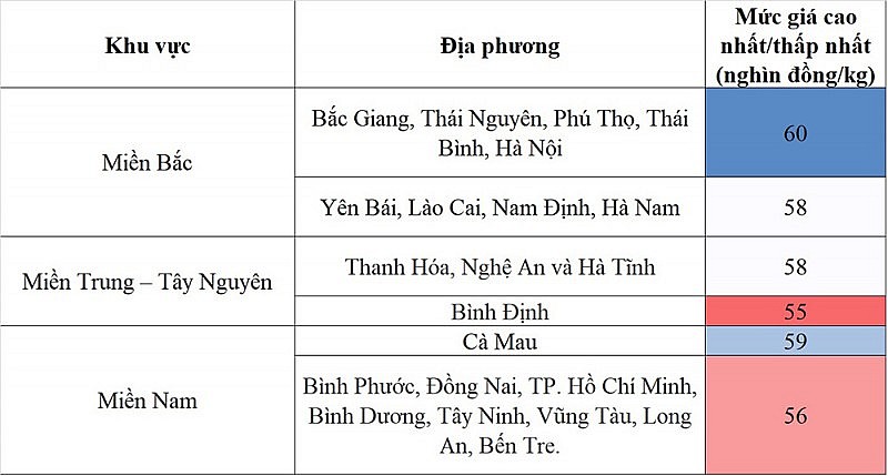 Theo đó, mức giá cao nhất khu vực 58.000 đồng/kg được ghi nhận tại Thanh Hóa, Nghệ An và Hà Tĩnh.