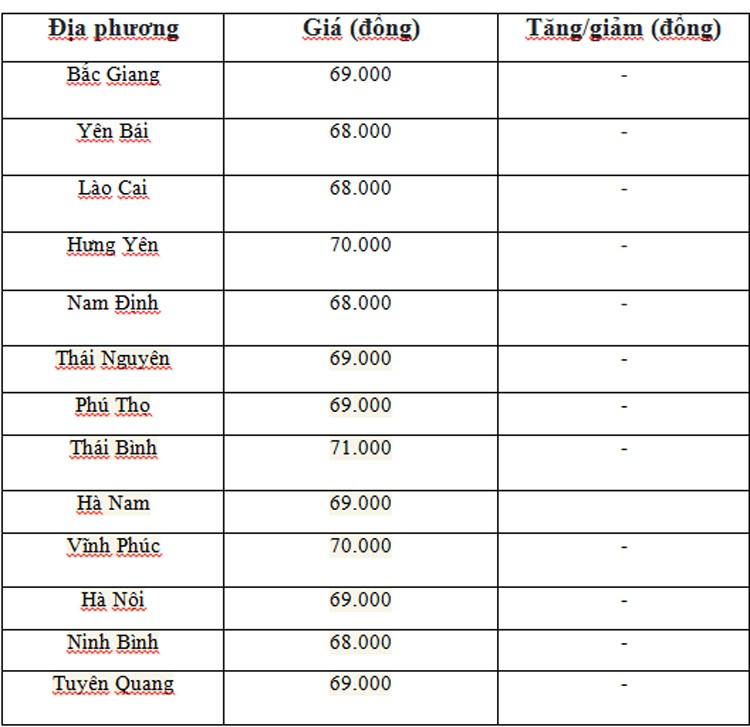 Cụ thể, mức giá cao nhất khu vực 71.000 đồng/kg được ghi nhận tại Thái Bình đây cũng là mức giá cao nhất cả nước.