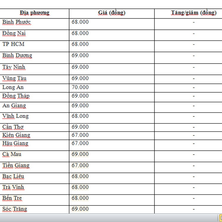 Theo đó, mức giá cao nhất khu vực 70.000 đồng/kg được ghi nhận tại Long An. Trong khi đó, các tỉnh Kiên Giang, Hậu Giang và Tiền Giang đang neo ở mức thấp nhất là 67.000 đồng/kg.